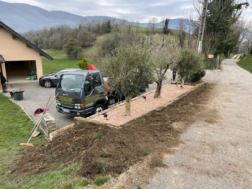 Réalisation des travaux avec pelleteuse, livraison & plantation de 3 oliviers, finition au graviers rose.